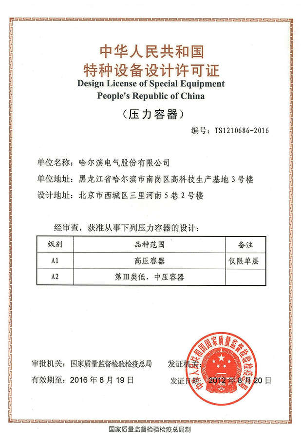 公司取得国家A1、A2级压力容器设计许可证